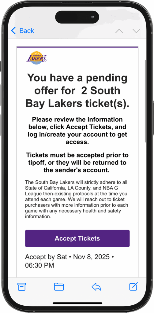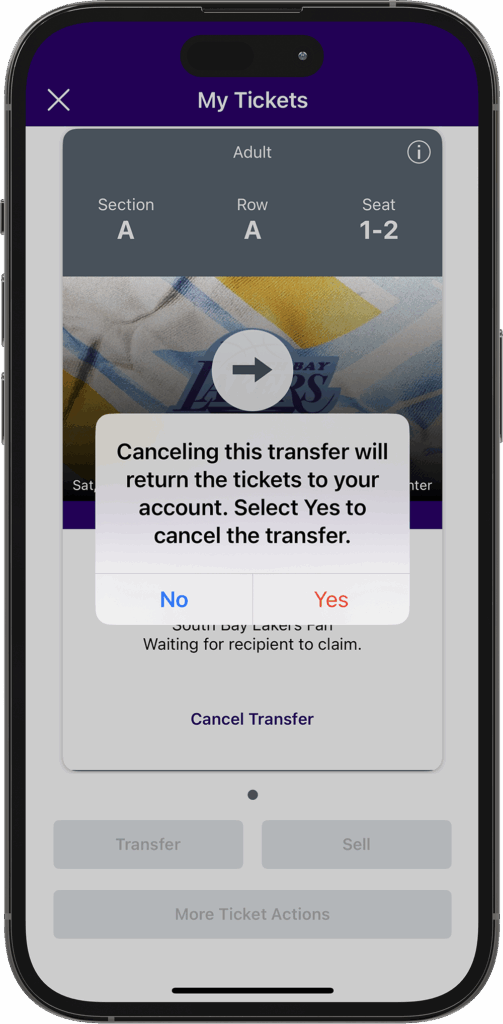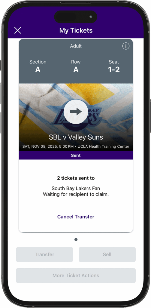 Ticket transferring allows you to send tickets electronically to anyone with a valid e-mail address. With the South Bay Lakers Mobile App, you can text or e-mail a link to transfer your tickets. Tickets will remain in your account until your recipient accepts the transfer, or until the transfer expires.