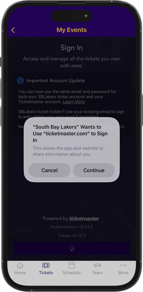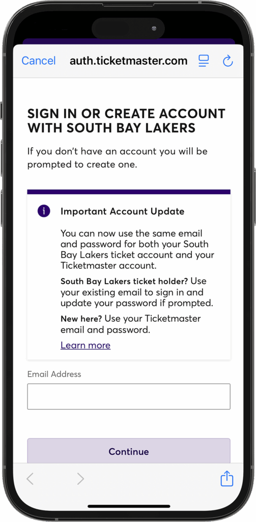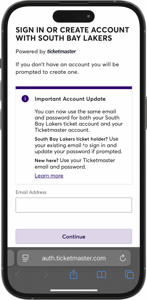 Click Continue. You can use your same login credentials as Ticketmaster.com to access South Bay Lakers Account Manager.
