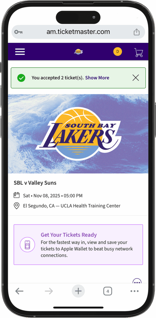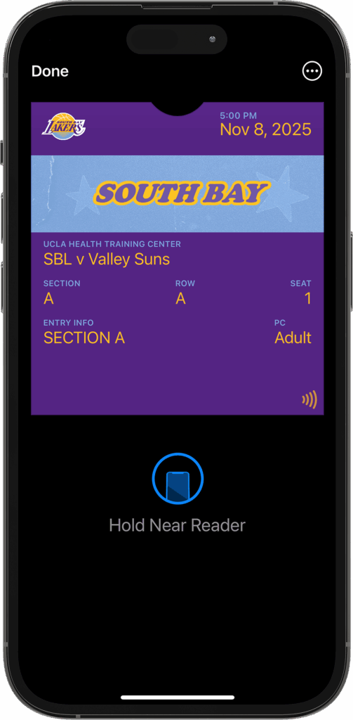 - Scan tickets from your Mobile Wallet at the gate by tapping or holding your phone near the reader. If you are unable to access your Mobile Wallet, you can scan the rotating barcode on gameday through the South Bay Lakers Mobile App.